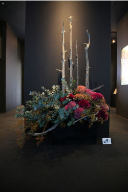 前期は田澤凉社中、後期は日向洋一社中が、ギャラリーやモデルルーム各室を季節感あふれる草月の花で彩りました。前期と後期とでは作品の趣きも異なり、来場者にそれぞれの素晴らしい「秋風のおもてなし」を感じていただくことができました。