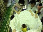 今年の「草月の秋」、神奈川県支部のテーマは「re‐autumn」。2月の本部主催支部研究会で取り組んだユポ紙と燻製孟宗竹を使って制作しました。南館6階ホワイトモールでひときわ目を引くこの作品には、「まるで作品から光が放たれているかのよう」「大胆でおおらかなフォルムが、どこか植物を彷彿とさせ見ていて面白かった」「ユポ紙の表面が花の模様のよう」等のお声をいただき、大好評でした。今回は7名の皆様に参加いただき、支部スタッフと作品を作り上げました。