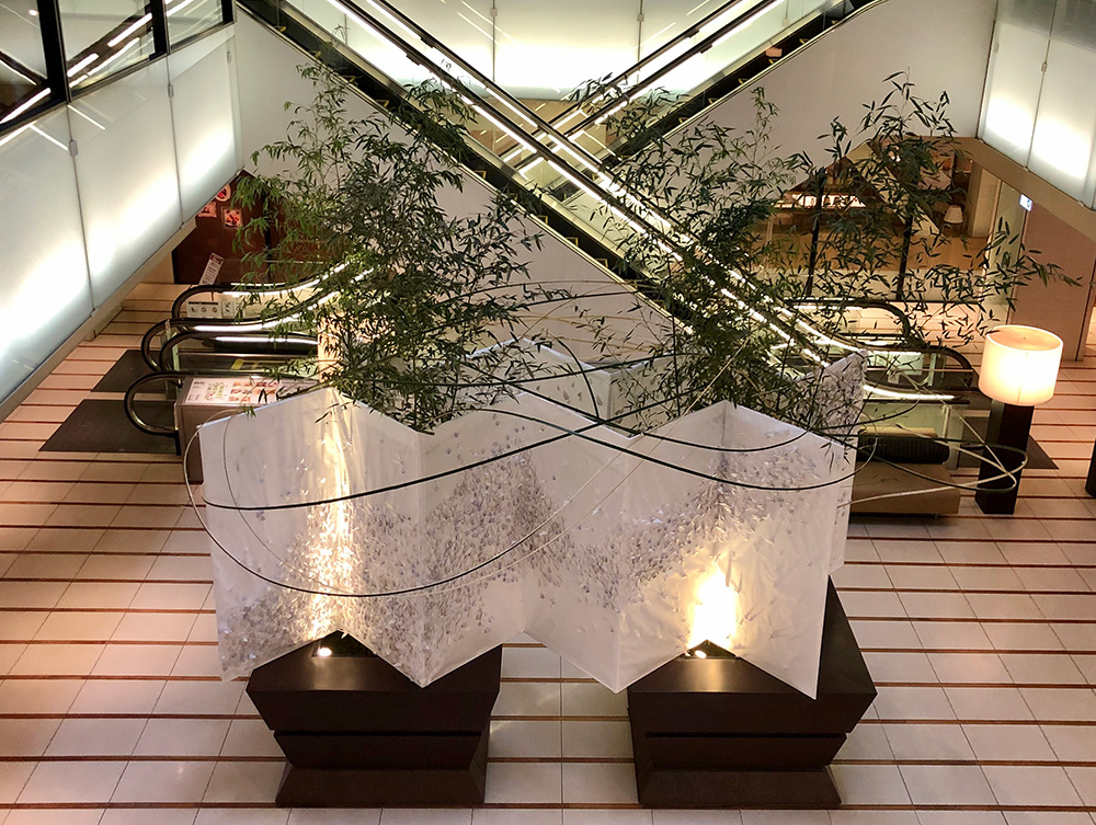 真っ白い和紙の屏風に、願いを込めて折られた何千羽の鶴が舞い、ライティングにより和紙が透け、明日への希望を感じます。