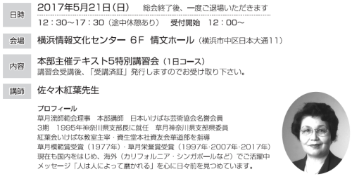 昨年度、新テキスト「草月のいけばな5」が発刊され、既に本部では新テキストによる特別講習会が開催されております。 さて、この度、本部主催支部講習会としてテキスト5特別講習会(1日)を家元の選任で佐々木紅葉先生を講師にお迎えして開催いたします。 ご指導されている先生方は、この受講が必須となります。 既に受講された皆様も、この機会を待たれていた皆様も、ぜひお出かけください。