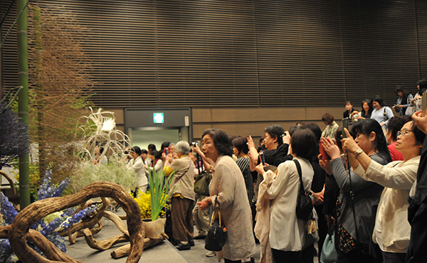 「いけばなで一番大事なのは思いやりの心」見てくださる方、花、器に思いやりを持つというメッセージに始まり、歴代の家元や自作花器、花鋏のエピソードを交えながらも、赤、緑、白、青、紫の色彩鮮やかな6 作品がまたたく間に出来上がり、いっときも目を離せない魅力に引き込まれていきました。